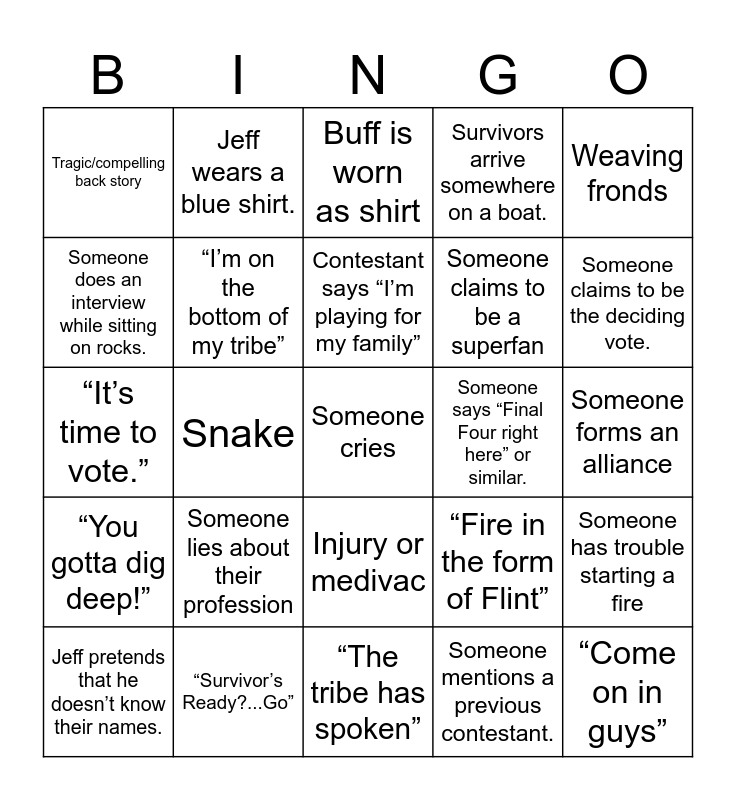 This bingo card has 41 words: Scheming at the water well, “It’s time to vote.”, “Nice Save” during a challenge, “I’m on the bottom of my tribe”, “Survivor’s Ready?...Go”, Injury or medivac, Contestant says “I’m playing for my family”, Talks about Survivor “bucket list”, Weaving fronds, “You gotta dig deep!”, Snake, Survivors arrive somewhere on a boat., Someone cries, Someone forms an alliance, Someone says “Final Four right here” or similar., Someone lies about their profession, Someone mentions the “New Era of Survivor”, Tragic/compelling back story, Have to untie knots at challenge, Buff is worn as shirt, Someone has trouble starting a fire, “Come on in guys”, “The tribe has spoken”, Someone claims to be a superfan, “You’re my number one.”, Jeff tells us to apply for Survivor., Someone mentions a previous contestant., Someone loses a vote., Someone claims to be the deciding vote., Challenge involves a puzzle, Someone complains that fellow tribe member is lazy., Jeff wears a blue shirt., Jeff pretends that he doesn’t know their names., Jeff wears a hat., “Fire in the form of Flint”, Someone does an interview while sitting on rocks., Cut something with a machete., One person per tribe chosen for special adventure/challenge., Tribe talking while in the water., Someone hunts for an immunity idol. and Someone talks about watching Survivor as a kid..