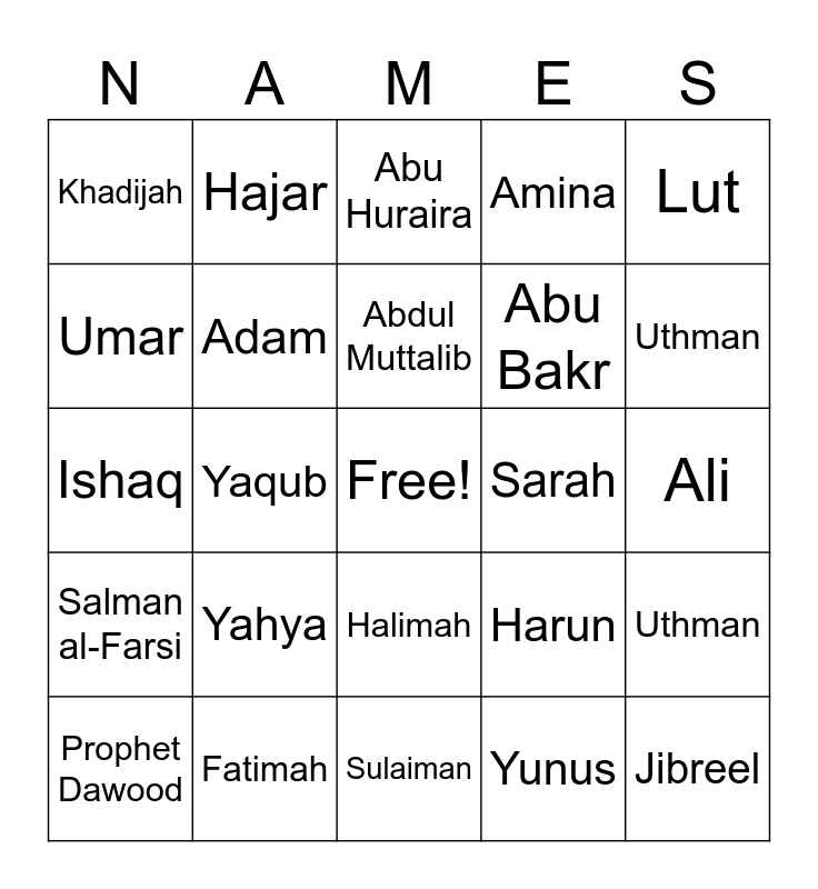 This bingo card has a free space and 29 words: Prophet Dawood, Maryam, Yaqub, Nuh, Khadijah, Abu Huraira, Adam, Yahya, Sarah, Fatimah, Ali, Jibreel, Sulaiman, Yunus, Uthman, Abu Talib, Halimah, Salman al-Farsi, Lut, Ishaq, Harun, Yusuf, Abu Bakr, Umar, Amina, Hajar, Uthman, Abdul Muttalib and Israfil.