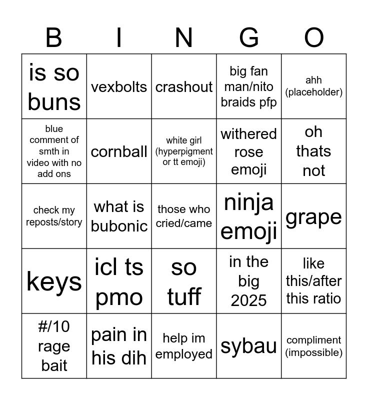 This bingo card has a free space and 24 words: icl ts pmo, pain in his dih, white girl (hyperpigment or tt emoji), #/10 rage bait, ahh (placeholder), is so buns, blue comment of smth in video with no add ons, vexbolts, ninja emoji, so tuff, withered rose emoji, check my reposts/story, in the big 2025, like this/after this ratio, cornball, sybau, grape, crashout, oh thats not, what is bubonic, compliment (impossible), keys, big fan man/nito braids pfp and help im employed.