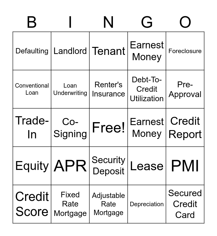 This bingo card has a free space and 24 words: Credit Score, APR, Renter's Insurance, Depreciation, Foreclosure, Defaulting, Landlord, Tenant, Earnest Money, Credit Report, Trade-In, Loan Underwriting, Lease, PMI, Conventional Loan, Fixed Rate Mortgage, Adjustable Rate Mortgage, Earnest Money, Pre-Approval, Equity, Co-Signing, Security Deposit, Debt-To-Credit Utilization and Secured Credit Card.