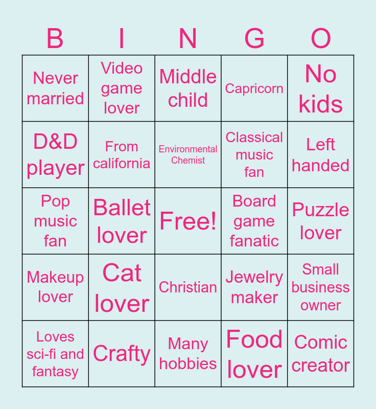 This bingo card has a free space and 24 words: Cat lover, Crafty, Environmental Chemist, Loves sci-fi and fantasy, No kids, Never married, D&D player, Video game lover, Board game fanatic, Christian, Classical music fan, Pop music fan, Jewelry maker, Small business owner, From california, Food lover, Puzzle lover, Middle child, Left handed, Ballet lover, Comic creator, Makeup lover, Capricorn and Many hobbies.