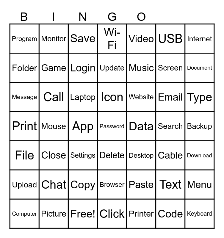 This bingo card has 51 words: Computer, Screen, Keyboard, Mouse, Laptop, Desktop, Monitor, Printer, USB, Cable, Internet, Wi-Fi, Email, Website, Browser, File, Folder, Document, Picture, Video, Music, App, Program, Game, Free!, Password, Login, Click, Type, Save, Open, Close, Copy, Paste, Delete, Print, Search, Download, Upload, Chat, Message, Call, Text, Code, Data, Backup, Update, Settings, Menu, Icon and Link.