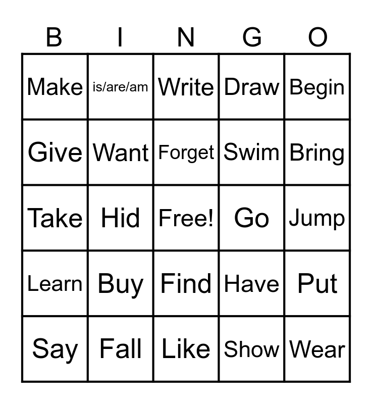This bingo card has a free space and 24 words: Buy, Fall, Forget, Say, Begin, Make, Give, is/are/am, Go, Find, Swim, Take, Have, Put, Want, Show, Jump, Write, Bring, Hid, Wear, Learn, Draw and Like.