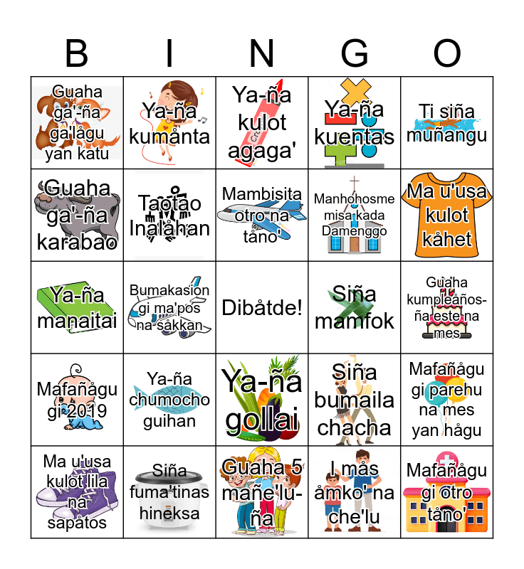 This bingo card has 28 images, a free space and 29 words: Ma u'usa kulot lila na sapåtos, Humugagåndo "soccer", Bumakasion gi ma'pos na såkkan, Guaha che'lu-ña palao'an, Guaha ga'-ña ga'lågu yan katu, Ya-ña kulot agaga', Taotao Inalåhan, Ya-ña chumocho guihan, Siña mamfok, Siña fuma'tinas hineksa, Guaha kumpleåños-ña este na mes, Mafañågu gi otro tåno', Guaha 5 mañe'lu-ña, I mås åmko' na che'lu, Ma u'usa kulot kåhet, Mamångge' ni akague kannai-ña, Ya-ña gollai, Mafañågu gi 2019, Ti siña muñangu, Ya-ña manaitai, Siña bumaila chacha, Siña ma kåmyu niyok, Manhohosme misa kada Damenggo, Guaha ga'-ña karabao, Ya-ña kuentas, Ya-ña kumånta, Mafañågu gi parehu na mes yan hågu, Mambisita otro na tåno' and Ma tungo' un kåntan JD Crutch.