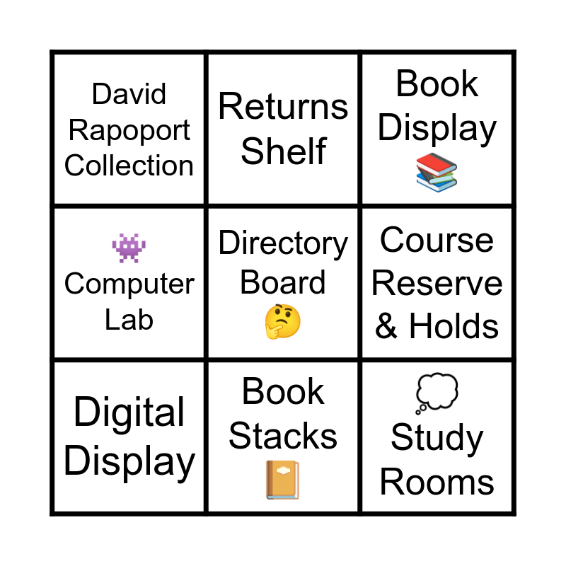 This bingo card has 9 words: Digital Display, Book Display 📚, Returns Shelf, 👾 Computer Lab, David Rapoport Collection, Course Reserve & Holds, Directory Board 🤔, 💠Study Rooms and Book Stacks 📔.
