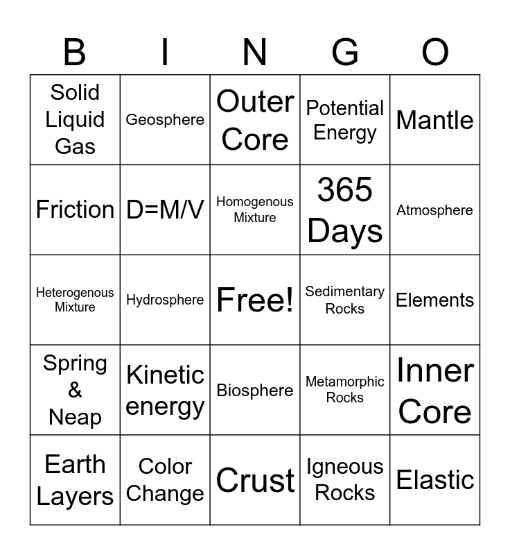 This bingo card has a free space and 24 words: Earth Layers, Kinetic energy, Homogenous Mixture, Igneous Rocks, Mantle, Solid Liquid Gas, Geosphere, Outer Core, Sedimentary Rocks, Elements, Heterogenous Mixture, D=M/V, Metamorphic Rocks, Inner Core, Friction, Color Change, Crust, Potential Energy, Atmosphere, Spring & Neap, Hydrosphere, Biosphere, 365 Days and Elastic.