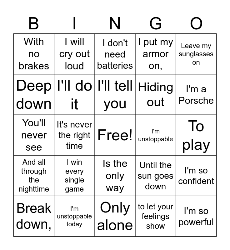 This bingo card has a free space and 36 words: All smiles,, I know what it takes, to fool this town, I'll do it, Until the sun goes down, And all through the nighttime, I'll tell you, what you wanna hear, Leave my sunglasses on, While I shed a tear, It's never the right time, I put my armor on,, Show you how strong I am, I'm unstoppable, I'm a Porsche, With no brakes, I'm invincible, I win every single game, I'm so powerful, I don't need batteries, To play, I'm so confident, I'm unstoppable today, Break down,, Only alone, I will cry out loud, You'll never see, What's hiding out, Hiding out, Deep down, I know,, I've heard that, to let your feelings show, Is the only way, To make friendships grow and But I'm too afraid now.
