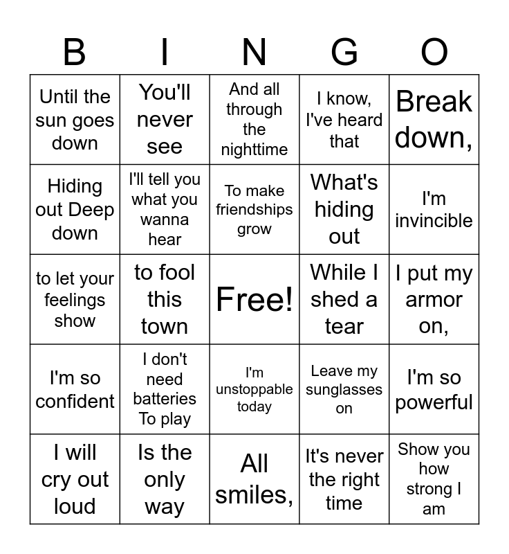 This bingo card has a free space and 31 words: All smiles,, I know what it takes, to fool this town, I'll do it, Until the sun goes down, And all through the nighttime, I'll tell you what you wanna hear, Leave my sunglasses on, While I shed a tear, It's never the right time, I put my armor on,, Show you how strong I am, I'm unstoppable, I'm a Porsche With no brakes, I'm invincible, I win every single game, I'm so powerful, I don't need batteries To play, I'm so confident, I'm unstoppable today, Break down,, Only alone, I will cry out loud, You'll never see, What's hiding out, Hiding out Deep down, I know, I've heard that, to let your feelings show, Is the only way, To make friendships grow and But I'm too afraid now.