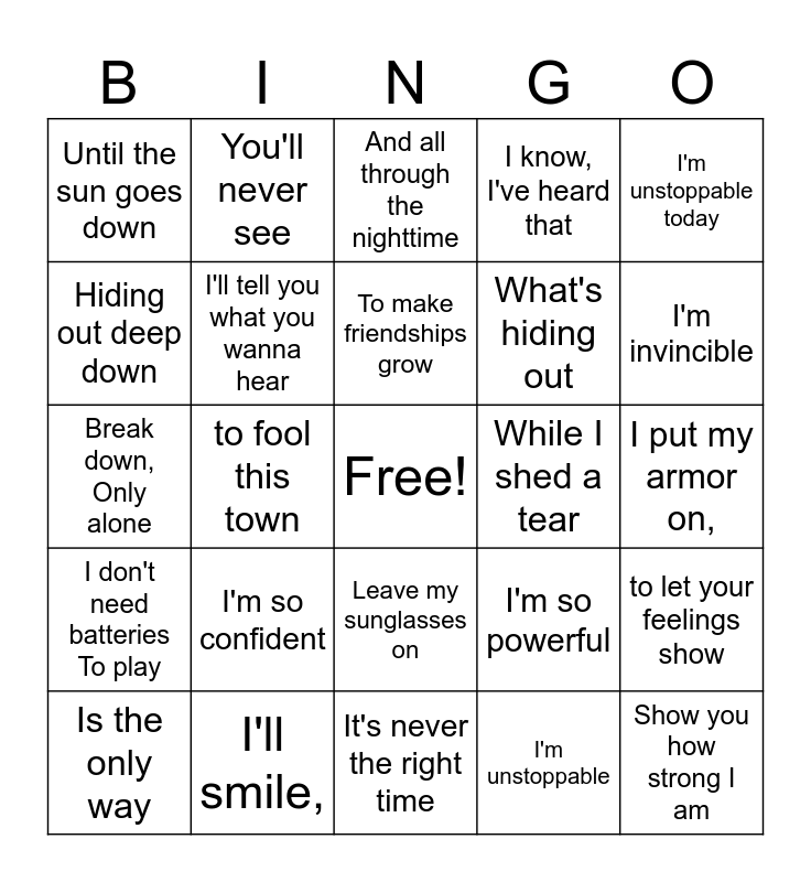 This bingo card has a free space and 30 words: I'll smile,, I know what it takes, to fool this town, I'll do it, Until the sun goes down, And all through the nighttime, I'll tell you what you wanna hear, Leave my sunglasses on, While I shed a tear, It's never the right time, I put my armor on,, Show you how strong I am, I'm unstoppable, I'm a Porsche With no brakes, I'm invincible, I win every single game, I'm so powerful, I don't need batteries To play, I'm so confident, I'm unstoppable today, Break down, Only alone, I will cry out loud, You'll never see, What's hiding out, Hiding out deep down, I know, I've heard that, to let your feelings show, Is the only way, To make friendships grow and But I'm too afraid now.