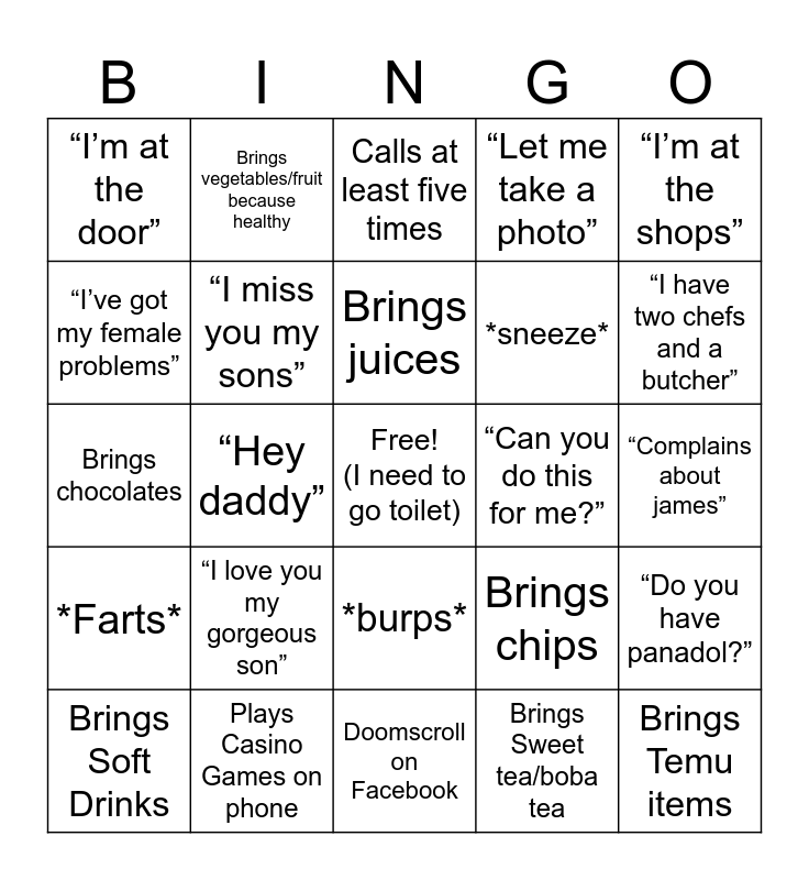 This bingo card has a free space and 24 words: Brings Soft Drinks, “I love you my gorgeous son”, Brings juices, Brings Sweet tea/boba tea, “I’m at the shops”, “I’m at the door”, Brings vegetables/fruit because healthy, Calls at least five times, “Can you do this for me?”, “Complains about james”, Brings chocolates, “I miss you my sons”, Brings chips, “Do you have panadol?”, “I’ve got my female problems”, Plays Casino Games on phone, Doomscroll on Facebook, “Let me take a photo”, “I have two chefs and a butcher”, *Farts*, “Hey daddy”, *burps*, *sneeze* and Brings Temu items.