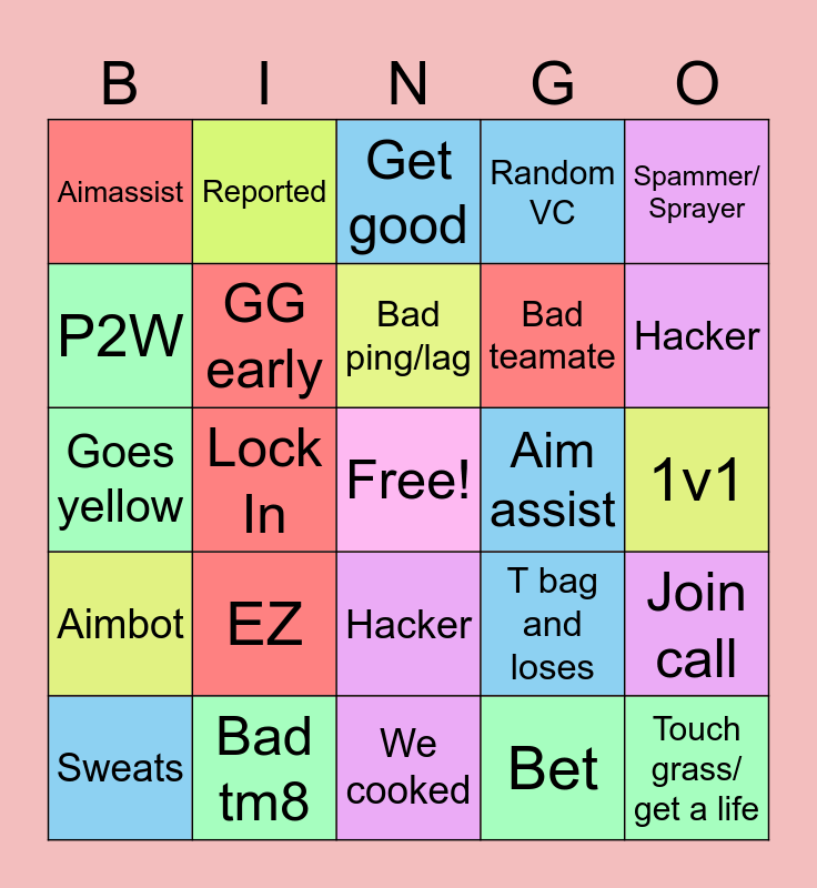 This bingo card has a free space and 24 words: EZ, Bad tm8, Bad ping/lag, Sweats, Spammer/ Sprayer, Aimassist, P2W, Reported, Aim assist, Hacker, Bad teamate, Goes yellow, T bag and loses, Join call, GG early, Bet, 1v1, Get good, Hacker, Lock In, Touch grass/ get a life, Aimbot, Random VC and We cooked.