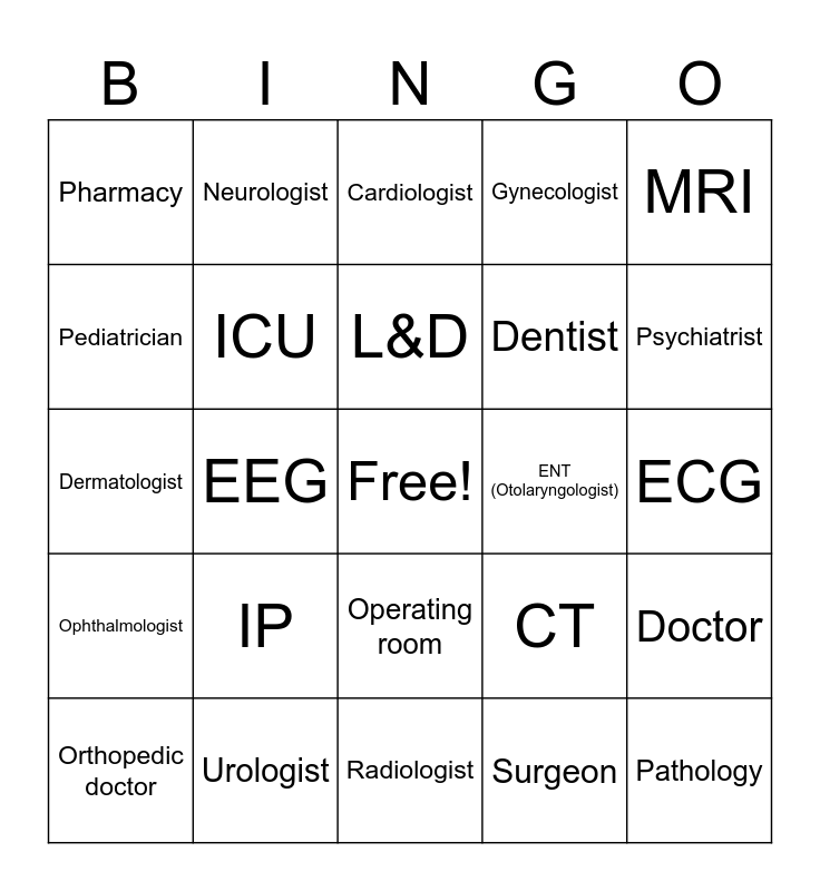This bingo card has a free space and 28 words: Doctor, Nurse, Dentist, Surgeon, Pediatrician, Cardiologist, Neurologist, Ophthalmologist, ENT (Otolaryngologist), Orthopedic doctor, Dermatologist, Gynecologist, Urologist, Radiologist, Psychiatrist, OPD, IP, ICU, L&D, Operating room, Pharmacy, Radiology, Pathology, EEG, ECG, CT, MRI and Ultrasonography.