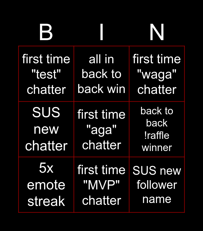 This bingo card has a free space and 8 words: back to back !raffle winner, first time "waga" chatter, all in back to back win, 5x emote streak, first time "test" chatter, SUS new follower name, SUS new chatter and first time "MVP" chatter.