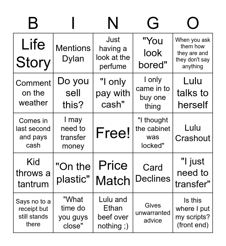 This bingo card has a free space and 24 words: "On the plastic", "What time do you guys close", "I only pay with cash", Says no to a receipt but still stands there, When you ask them how they are and they don't say anything, Life Story, Comment on the weather, Mentions Dylan, "I thought the cabinet was locked", Price Match, I only came in to buy one thing, Comes in last second and pays cash, Card Declines, "I just need to transfer", Do you sell this?, Gives unwarranted advice, Lulu Crashout, Just having a look at the perfume, Lulu talks to herself, I may need to transfer money, Is this where I put my scripts? (front end), Kid throws a tantrum, "You look bored" and Lulu and Ethan beef over nothing ;).