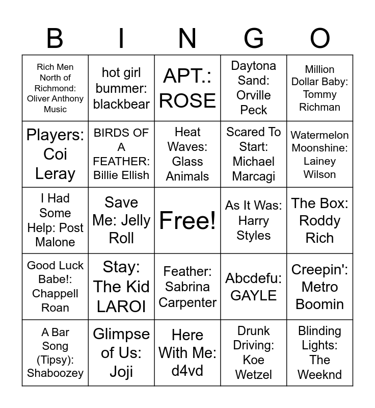 This bingo card has a free space and 52 words: Please Please Please: Sabrina Carpenter, Blinding Lights: The Weeknd, Love Tonight: Shouse, Here With Me: d4vd, Stay: The Kid LAROI, Fast Car: Luke Combs, hot girl bummer: blackbear, Titi Me Pregunto: Bad Bunny, Players: Coi Leray, End of Beginning: Djo, BIRDS OF A FEATHER: Billie Ellish, Positions: Ariana Grande, Creepin': Metro Boomin, Abcdefu: GAYLE, My Love Mine All Mine: Mitski, Bad Habit: Steve Lacy, Heat Waves: Glass Animals, As It Was: Harry Styles, Austin: Dasha, Million Dollar Baby: Tommy Richman, Save Me: Jelly Roll, Drunk Driving: Koe Wetzel, Rich Men North of Richmond: Oliver Anthony Music, Scared To Start: Michael Marcagi, Flower Shops: ERNEST, Sounds Like Something I'd Do: Drake Milligan, Four Leaf Clover: Gavin Adcock, Wondering Why: The Red Clay Strays, Watermelon Moonshine: Lainey Wilson, Use Me: Zach Top, TEXAS HOLD 'EM: Beyonce, Daytona Sand: Orville Peck, Borderline: Tame Impala, Lil Boo Thang: Paul Russell, BILLIE EILISH: Armani White, APT.: ROSE, Glimpse of Us: Joji, The Motto: Tiesto, Unholy: Sam Smith, Supalonely: BENEE, Lovin On Me: Jack Harlow, The Box: Roddy Rich, Good Luck Babe!: Chappell Roan, Kiss Me More: Doja Cat, Feather: Sabrina Carpenter, Happier Than Ever: Billie Ellish, Kill Bill: SZA, I Had Some Help: Post Malone, Save Your Tears: The Weeknd, Say So: Doja Cat, A Bar Song (Tipsy): Shaboozey and Flowers: Miley Cyrus.