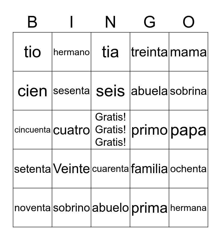 This bingo card has a free space and 24 words: Veinte, sobrino, seis, noventa, mama, tio, cien, hermano, primo, cuarenta, abuela, cincuenta, familia, ochenta, sesenta, prima, papa, tia, sobrina, cuatro, hermana, setenta, treinta and abuelo.