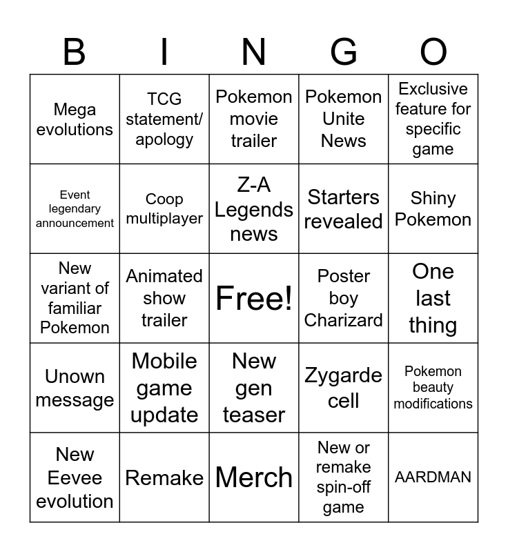 This bingo card has a free space and 24 words: Mobile game update, Remake, Z-A Legends news, New Eevee evolution, Exclusive feature for specific game, Mega evolutions, Event legendary announcement, TCG statement/ apology, Poster boy Charizard, New gen teaser, Starters revealed, New variant of familiar Pokemon, Zygarde cell, Pokemon beauty modifications, Coop multiplayer, New or remake spin-off game, One last thing, Pokemon movie trailer, Shiny Pokemon, Animated show trailer, AARDMAN, Unown message, Pokemon Unite News and Merch.