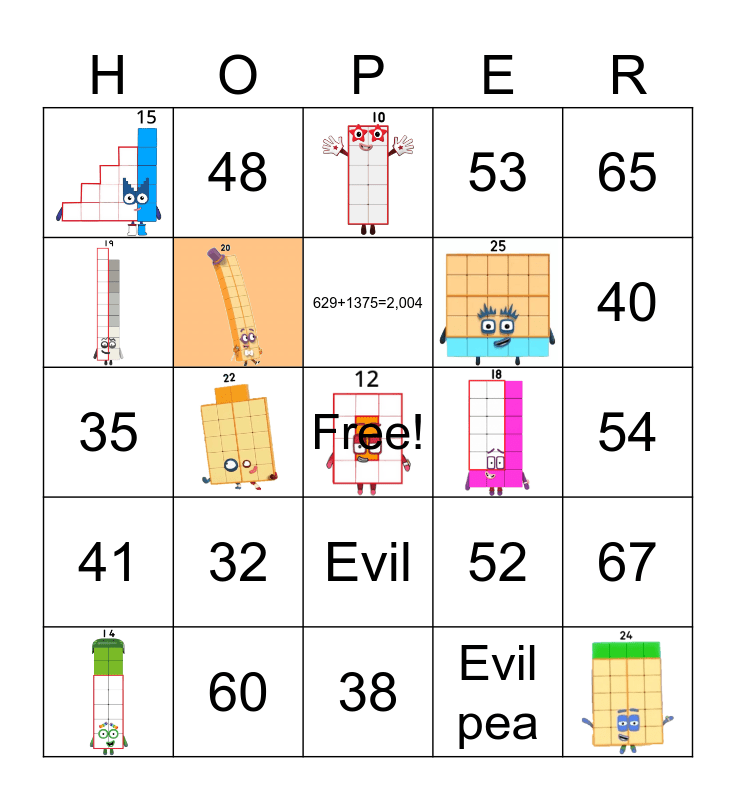 This bingo card has 29 images, a free space and 54 words: 31, 32, 33, 34, 35, 36, 37, 38, 39, 40, 41, 42, 43, 44, 45, 46, 47, 48, 49, 50, 51, 52, 53, 54, 55, 56, 57, 58, 59, 60, 61, 62, 63, 64, 65, 66, 67, 68, 69, 70, 71, 72, 73, 1-10-20-30=-59, Evil, Evil pea, 629+663=1,292, 924+1375=2,299, 629+1375=2,004, 663+924=1,587, 924+663=1,587, 1375+629=2,004, 663+629=1,292 and 1375+924=2,299.