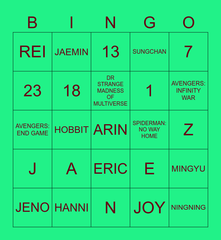This bingo card has a free space and 24 words: JENO, A, DR STRANGE MADNESS OF MULTIVERSE, JOY, 7, REI, JAEMIN, 13, SPIDERMAN: NO WAY HOME, Z, AVENGERS: END GAME, 18, E, MINGYU, 23, HANNI, N, SUNGCHAN, AVENGERS: INFINITY WAR, J, HOBBIT, ERIC, 1 and NINGNING.