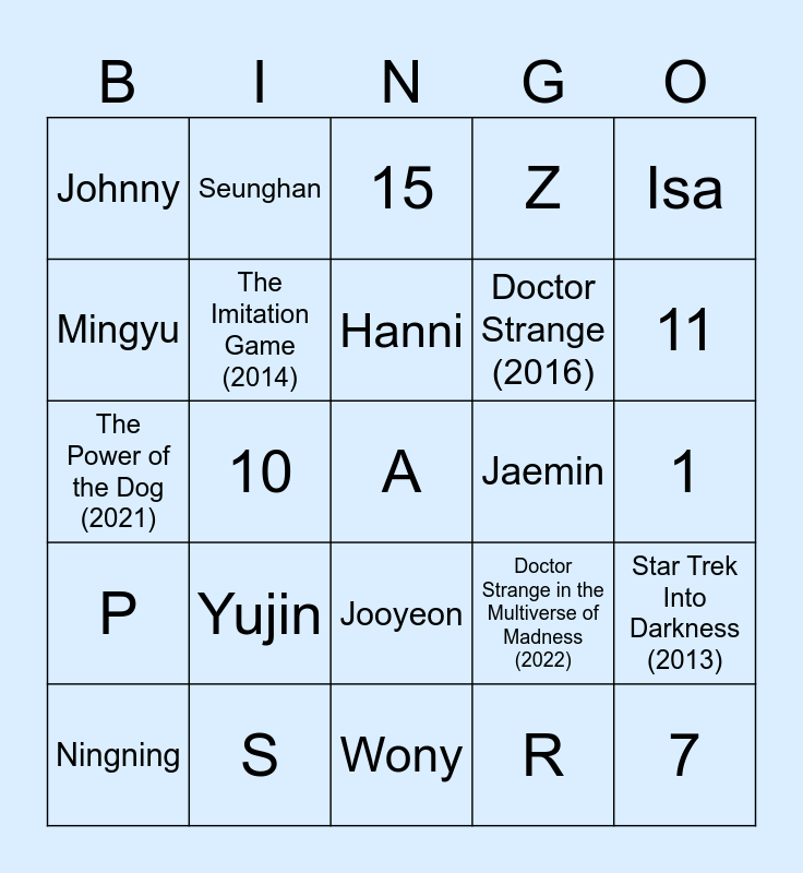 This bingo card has 25 words: Yujin, Wony, Hanni, Ningning, Isa, Johnny, Mingyu, Seunghan, Jaemin, Jooyeon, Doctor Strange (2016), The Power of the Dog (2021), Doctor Strange in the Multiverse of Madness (2022), Star Trek Into Darkness (2013), The Imitation Game (2014), 7, 1, 15, 11, 10, A, S, P, Z and R.