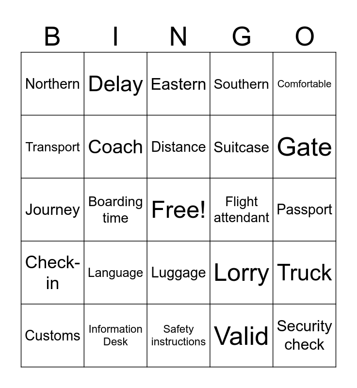 This bingo card has a free space and 33 words: Airport, Arrival, Boarding time, Cab, Check-in, Coach, Comfortable, Customs, Delay, Destination, Distance, Eastern, Ferry, Flight, Flight attendant, Gate, Information Desk, Journey, Language, Lorry, Luggage, Minibus, Northern, Passport, Safety instructions, Security check, Southern, Suitcase, Transport, Truck, Underground, Valid and Western.
