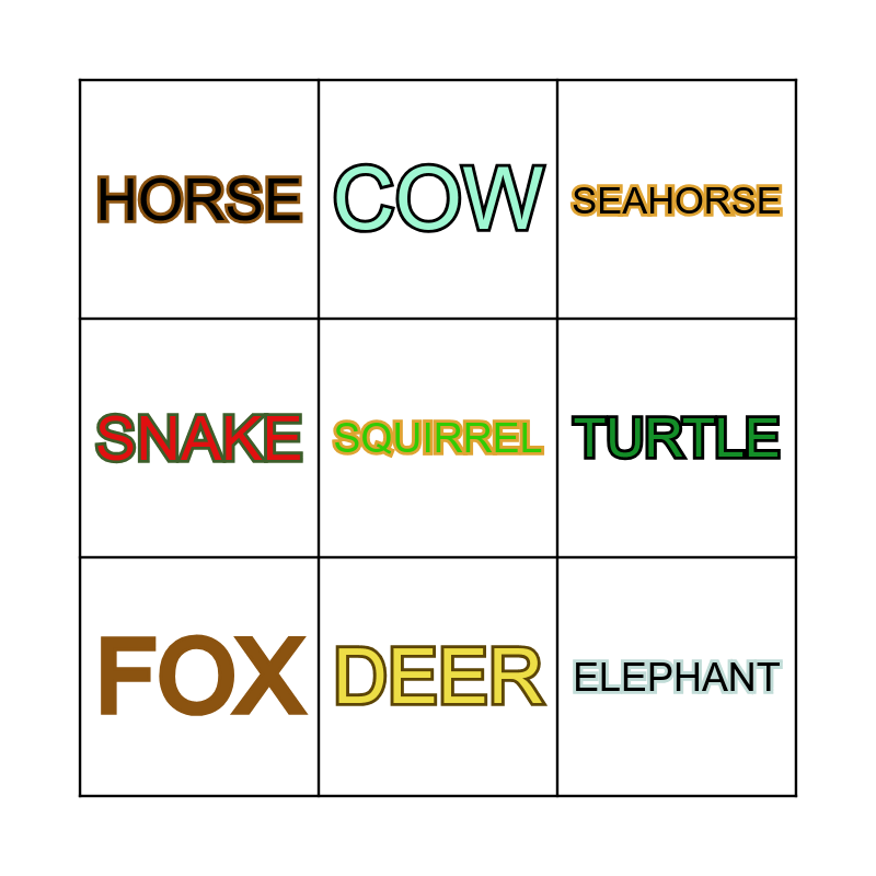 This bingo card has a free space and 8 words: TURTLE, SEAHORSE, COW, FOX, HORSE, ELEPHANT, SNAKE and DEER.