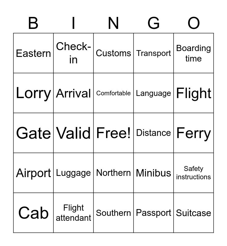 This bingo card has a free space and 33 words: Truck, Underground, Valid, Western, Airport, Arrival, Boarding time, Cab, Check-in, Coach, Comfortable, Customs, Delay, Destination, Distance, Flight, Flight attendant, Gate, Luggage, Minibus, Northern, Journey, Eastern, Ferry, Southern, Suitcase, Transport, Language, Lorry, Safety instructions, Security check, Passport and Information Desk.
