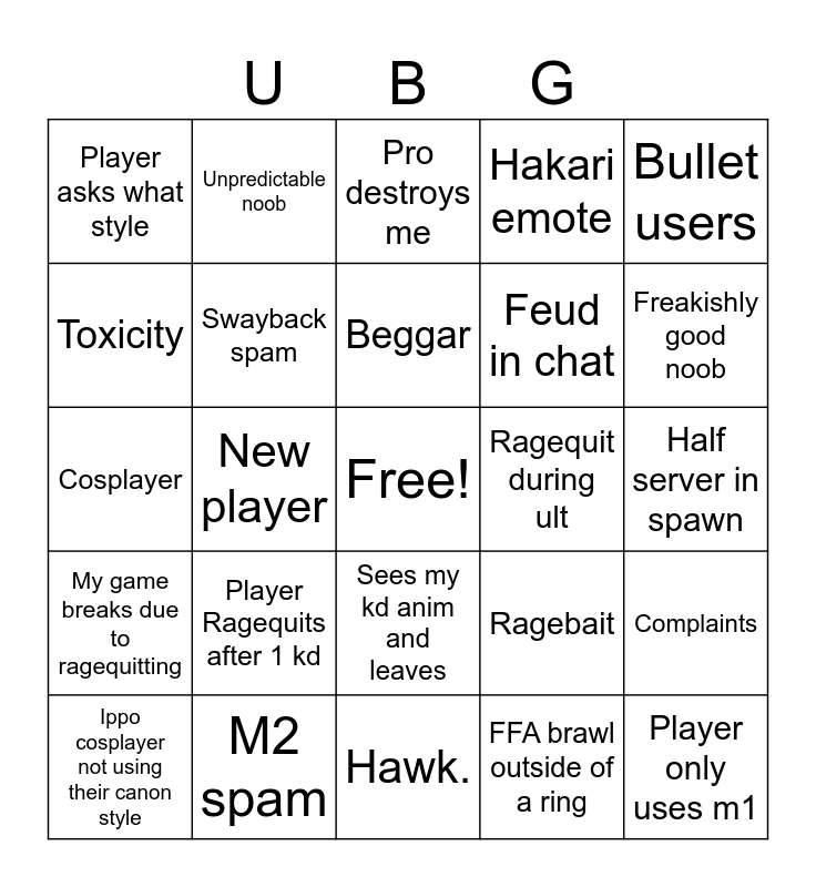 This bingo card has a free space and 24 words: Player Ragequits after 1 kd, M2 spam, Beggar, Ippo cosplayer not using their canon style, Bullet users, Player asks what style, Toxicity, Unpredictable noob, Ragequit during ult, Sees my kd anim and leaves, Feud in chat, Cosplayer, Ragebait, Complaints, Swayback spam, FFA brawl outside of a ring, Half server in spawn, Pro destroys me, Freakishly good noob, New player, Player only uses m1, My game breaks due to ragequitting, Hakari emote and Hawk..