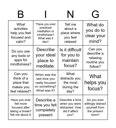 This bingo card has 16 words: Describe a time you felt completely present, What helps you focus?, Tell me about a place where you feel relaxed, What activities help you feel focused and calm?, Can you think of a place that makes you feel relaxed?, "Have you ever practiced meditation or mindfulness? What was it like?, What distracts you the most during the day?, Describe a time when you were distracted. How did it affect you?, Do you use any tools or apps for mindfulness?, Describe your ideal place to meditate., Have you ever felt more focused after taking a break? Tell me about it., What do you do to clear your mind?, When was the last time you really focused on something? What was it?, Can you describe a relaxing routine you follow?, Is it difficult for you to maintain focus? and Do you ever willingly distract yourself from the present mom?.