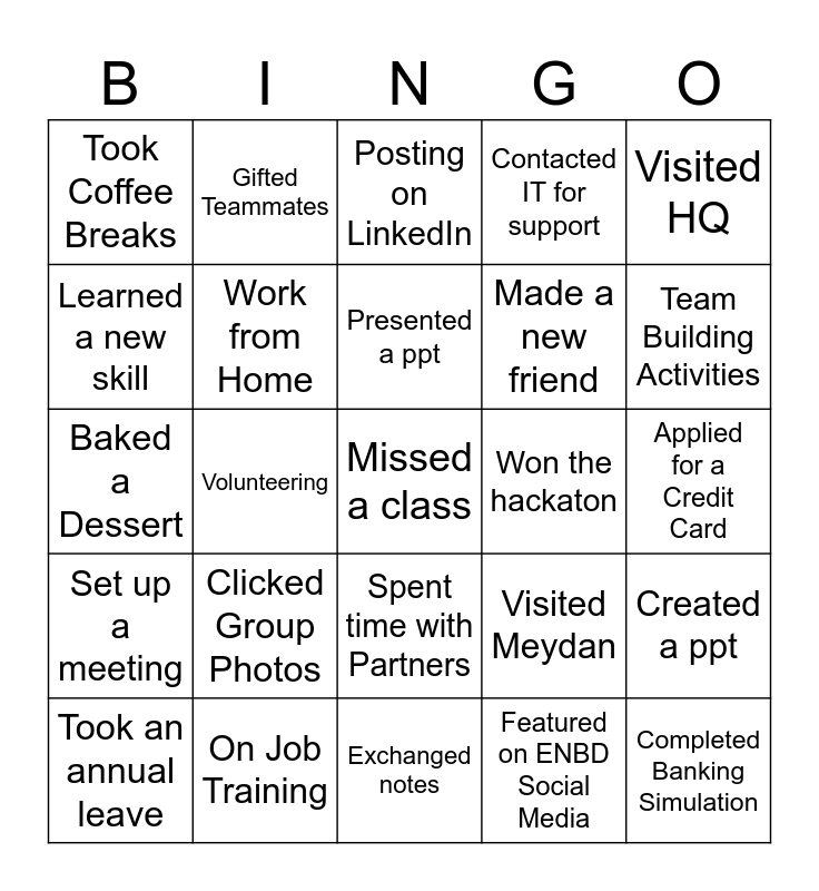 This bingo card has 25 words: Set up a meeting, On Job Training, Missed a class, Featured on ENBD Social Media, Visited HQ, Took Coffee Breaks, Gifted Teammates, Posting on LinkedIn, Won the hackaton, Created a ppt, Learned a new skill, Work from Home, Exchanged notes, Visited Meydan, Team Building Activities, Took an annual leave, Volunteering, Presented a ppt, Made a new friend, Applied for a Credit Card, Baked a Dessert, Clicked Group Photos, Spent time with Partners, Contacted IT for support and Completed Banking Simulation.