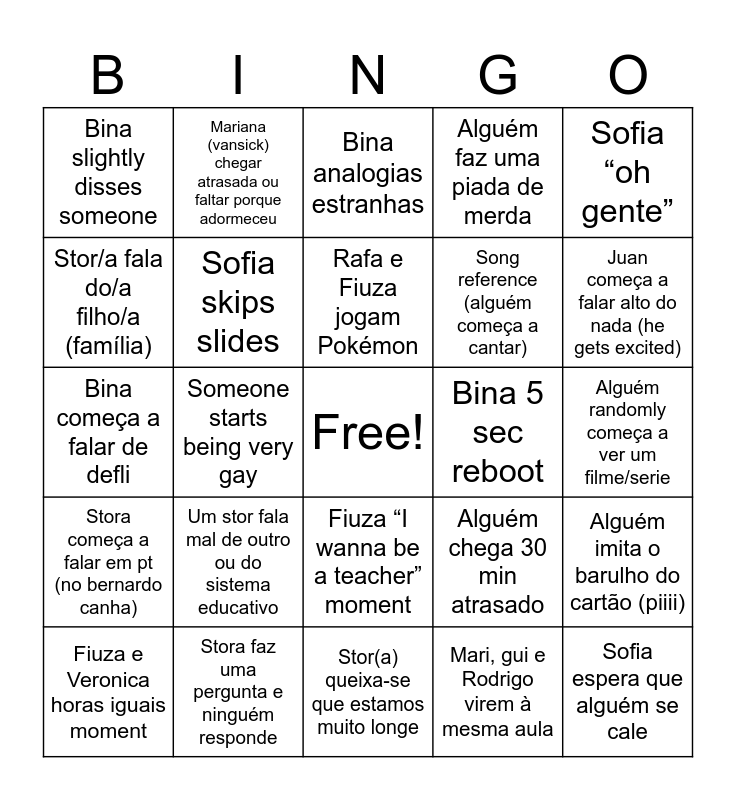 This bingo card has a free space and 34 words: Aula virou debate, Mari, gui e Rodrigo virem à mesma aula, Mags “alguém tem powerbank?”, Bina voice cracking, Stora começa a falar em pt (no bernardo canha), Sofia skips slides, Sofia “oh gente”, Fiuza e Veronica horas iguais moment, Mariana (vansick) chegar atrasada ou faltar porque adormeceu, Rio tintenses a falar de rio tinto, Rafa e Fiuza jogam Pokémon, Bina analogias estranhas, Alguém vem ajudar com o quadro (bónus sr Freitas), Rui fala de guerras, Bina 5 sec reboot, Juan começa a falar alto do nada (he gets excited), Stora faz uma pergunta e ninguém responde, Bina começa a falar de defli, Um stor fala mal de outro ou do sistema educativo, Alguém chega 30 min atrasado, Fiuza “I wanna be a teacher” moment, Alguém diz algo que seria controverso fora de contexto, Bina slightly disses someone, Alguém randomly começa a ver um filme/serie, Stor(a) queixa-se que estamos muito longe, Sofia espera que alguém se cale, Alguém faz uma piada de merda, Alguém se esquece de baixar o volume do tlm, Song reference (alguém começa a cantar), Stor/a fala do/a filho/a (família), Aula vira aula de história, Someone starts being very gay, Alguém imita o barulho do cartão (piiii) and Catarina e Maria Inês começam a falar de compras/ maquilhagem.