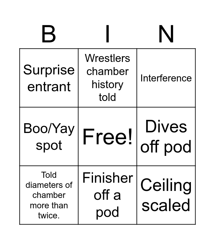 This bingo card has a free space and 11 words: Put through a pod, Finisher off a pod, Ceiling scaled, Told diameters of chamber more than twice., Wrestlers chamber history told, Interference, Dives off pod, Refusal pod exit, Boo/Yay spot, Surprise entrant and First blood.