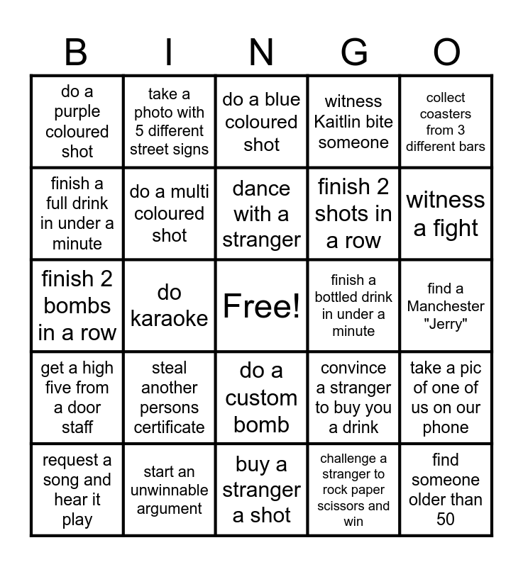 This bingo card has a free space and 31 words: buy a stranger a shot, take a picture with a stranger in pink, do karaoke, get someone's number, do a purple coloured shot, do a blue coloured shot, do a multi coloured shot, convince a stranger to buy you a drink, finish a bottled drink in under a minute, challenge a stranger to rock paper scissors and win, find a Manchester "Jerry", find someone older than 50, get your ID checked, find someone wearing sunglasses inside, witness a fight, witness someone fall over, take a pic of one of us on our phone, steal another persons certificate, get a high five from a door staff, do a custom bomb, collect coasters from 3 different bars, see someone in drag, request a song and hear it play, take a photo with 5 different street signs, finish 2 shots in a row, finish a full drink in under a minute, witness Kaitlin bite someone, finish 2 bombs in a row, start an unwinnable argument, dance with a stranger and introduce yourself with fake name.