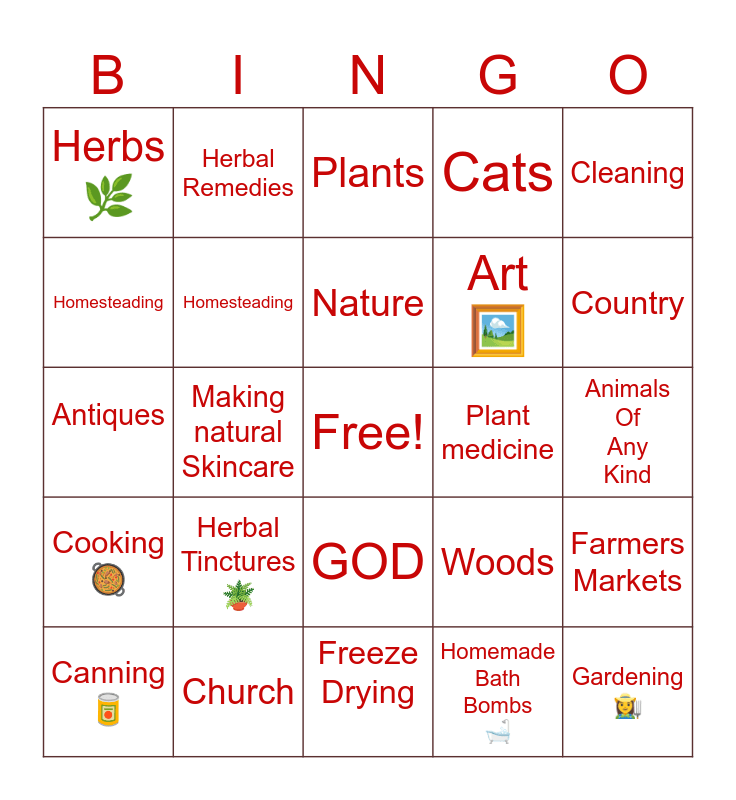 This bingo card has a free space and 29 words: God, Church, Plants, Cats ๐โโฌ, Cleaning, Herbs ๐ฟ, Homesteading, Nature, Plant medicine, Farmers Markets, Canning๐ฅซ, Making natural Skincare, Homemade Bath Bombs ๐, Gardening ๐ฉโ๐พ, Antiques, Pantry Room Ideas, Freeze Drying, Woods, Country, Cooking ๐ฅ, Herbal Tinctures ๐ชด, Jars Of โค๏ธ All Sorts ๐ซ, Art ๐ผ๏ธ, Animals Of Any Kind, Homesteading, Herbal Remedies, GOD, Cats and Cooking.