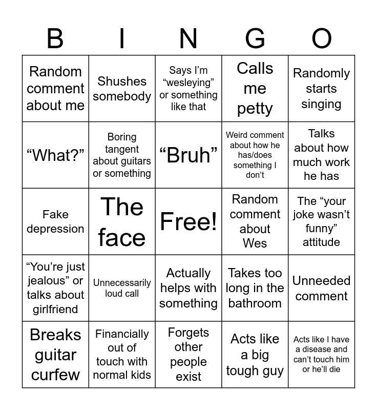 This bingo card has a free space and 33 words: Weird flex, Acts like a parent, The face, Unnecessarily rude, “You’re just jealous” or talks about girlfriend, Boring tangent about guitars or something, Randomly starts singing, Breaks guitar curfew, Shushes somebody, Complains about mom, “Bruh”, Says I’m “wesleying” or something like that, Calls me a magnet, Acts like he’s above me and Wes, Random comment about Wes, Talks about how much work he has, Financially out of touch with normal kids, Fake depression, Unnecessarily loud call, Takes too long in the bathroom, Actually helps with something, “I want to be back at Maple Park”, Random comment about me, The “your joke wasn’t funny” attitude, Forgets other people exist, Acts like I have a disease and can’t touch him or he’ll die, Calls me petty, Weird comment about how he has/does something I don’t, “What?”, Unneeded comment, Imitates me with a high pitched voice, Acts like a big tough guy and Threatens to do something just because he didn’t get his way.