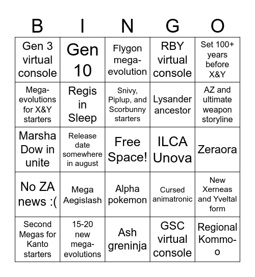 This bingo card has a free space and 24 words: Mega Aegislash, 15-20 new mega-evolutions, Snivy, Piplup, and Scorbunny starters, Second Megas for Kanto starters, Set 100+ years before X&Y, Gen 3 virtual console, Mega-evolutions for X&Y starters, Gen 10, ILCA Unova, Alpha pokemon, Lysander ancestor, Marsha Dow in unite, Cursed animatronic, New Xerneas and Yveltal form, Regis in Sleep, GSC virtual console, Zeraora, Flygon mega-evolution, AZ and ultimate weapon storyline, Release date somewhere in august, Regional Kommo-o, No ZA news :(, RBY virtual console and Ash greninja.