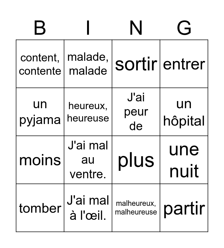 This bingo card has 26 words: un/une malade, un docteur, un hôpital, un médicament, un pyjama, content, contente, heureux, heureuse, malade, malade, malheureux, malheureuse, triste, triste, moins, plus, des chaussettes, une fois, une nuit, dormir, entrer, partir, sortir, tomber, J'ai mal au ventre., J'ai mal à la téte., J'ai mal à l'œil., J'ai mal aux genoux., J'ai peur de and Je suis malade..