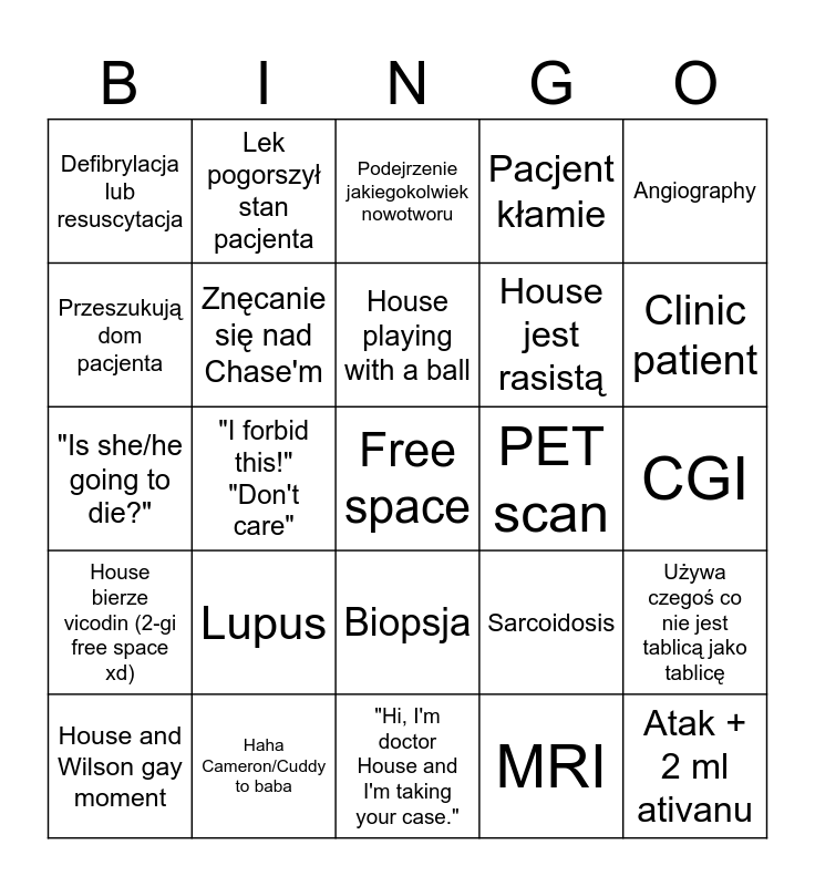 This bingo card has a free space and 24 words: Lupus, Haha Cameron/Cuddy to baba, House playing with a ball, House and Wilson gay moment, Angiography, Defibrylacja lub resuscytacja, Przeszukują dom pacjenta, Lek pogorszył stan pacjenta, PET scan, Biopsja, House jest rasistą, "Is she/he going to die?", Sarcoidosis, Używa czegoś co nie jest tablicą jako tablicę, Znęcanie się nad Chase'm, MRI, CGI, Podejrzenie jakiegokolwiek nowotworu, Clinic patient, "I forbid this!" "Don't care", Atak + 2 ml ativanu, House bierze vicodin (2-gi free space xd), Pacjent kłamie and "Hi, I'm doctor House and I'm taking your case.".