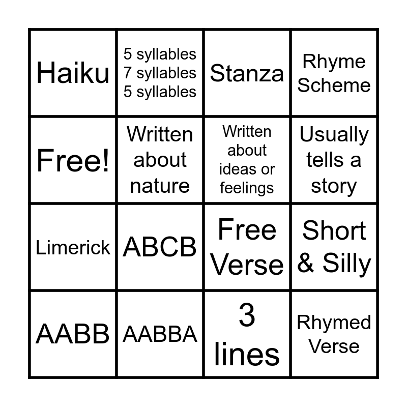 This bingo card has 16 words: AABBA, Short & Silly, Stanza, Haiku, Limerick, 5 syllables 7 syllables 5 syllables, Free Verse, 3 lines, Free!, Written about nature, AABB, Rhyme Scheme, ABCB, Usually tells a story, Written about ideas or feelings and Rhymed Verse.