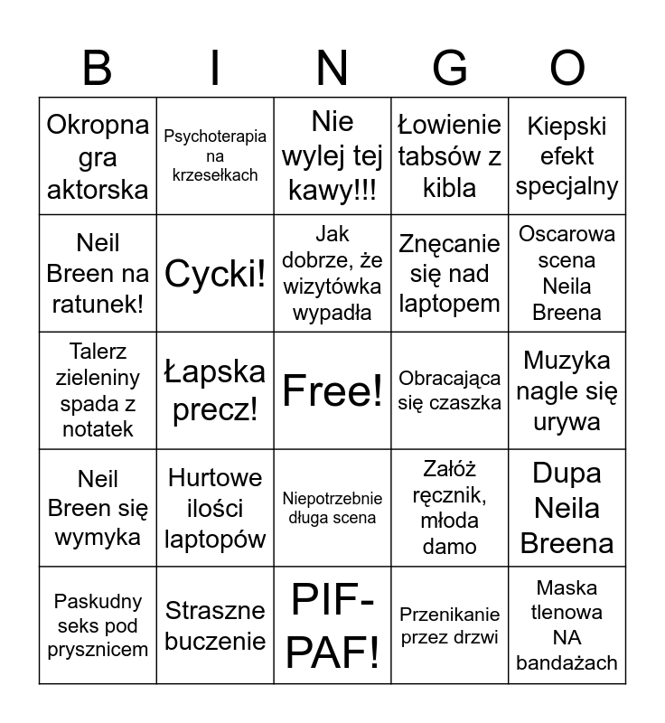 This bingo card has a free space and 37 words: „Dziś jest magiczny dzień!”, „Żadnych książek!”, Baaaaaaardzo długi stół, Cycki!, Dupa Neila Breena, Hurtowe ilości laptopów, Jak dobrze, że wizytówka wypadła, Kaczuchy albo gęsi w stawie, Kiepski efekt specjalny, Krew na czarnych lakierkach, Łapska precz!, Łowienie tabsów z kibla, Maska tlenowa NA bandażach, Muzyka nagle się urywa, Neil Breen na ratunek!, Neil Breen się wymyka, Neil Breen zachowuje się jak robot, Nie wylej tej kawy!!!, Niepotrzebnie długa scena, Obracająca się czaszka, Okropna gra aktorska, Oscarowa scena Neila Breena, Paskudny seks pod prysznicem, PIF-PAF!, Pomoczone łóżko, Przenikanie przez drzwi, Psychoterapia na krzesełkach, Rzeczy w domu same się ruszają, Scenografia z worków na śmieci, Seksy w plenerze, Spotkanie po latach, Straszne buczenie, Talerz zieleniny spada z notatek, Wielka księga, Załóż ręcznik, młoda damo, Znęcanie się nad laptopem and Zrywanie z siebie ubrania.