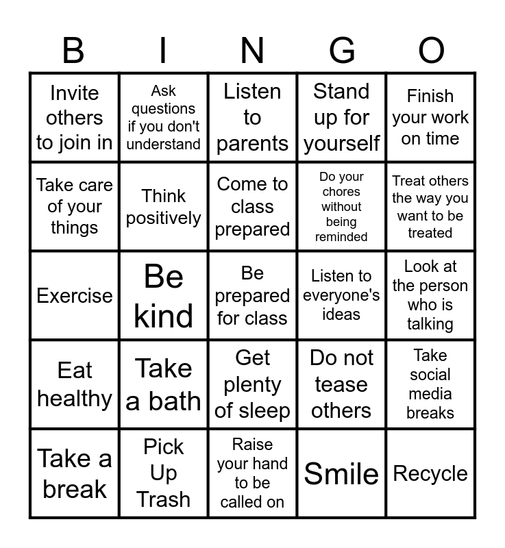 This bingo card has 30 words: Pick Up Trash, Think about how others feel, Be kind, Brush your teeth, Invite others to join in, Listen to parents, Think positively, Get plenty of sleep, Listen to everyone's ideas, Raise your hand to be called on, Look at the person who is talking, Be prepared for class, Smile, Recycle, Treat others the way you want to be treated, Be friendly, Do not tease others, Eat healthy, Take a bath, Finish your work on time, Exercise, Tell the truth, Ask questions if you don't understand, Do your chores without being reminded, Take care of your things, Stand up for yourself, Take social media breaks, Take a break, Come to class prepared and Use your resources.