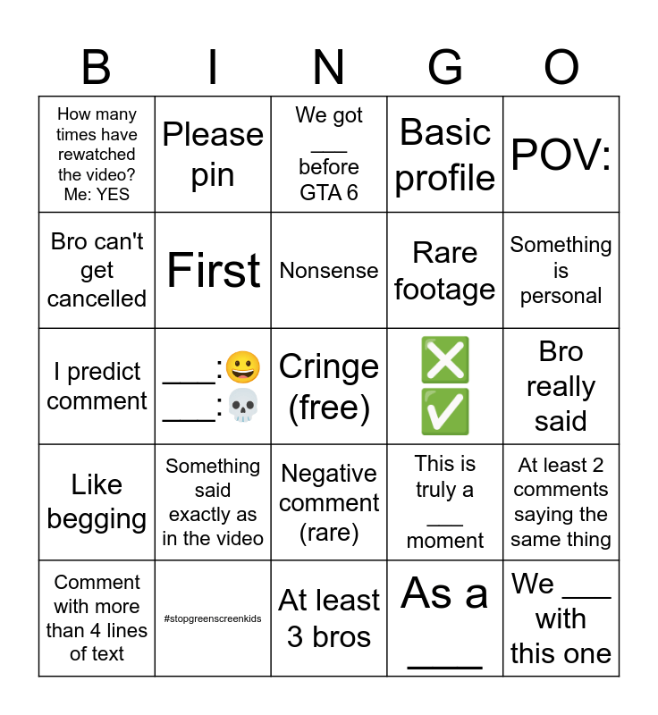 This bingo card has a free space and 31 words: At least 3 bros, At least 5 emojis, ___:😀 ___:💀, ___Got me dying, How many times have rewatched the video? Me: YES, We got ___ before GTA 6, First, This is truly a ___ moment, ❎ ✅, As a ___, Bro really said, We ___ with this one, Thought we wouldn't notice, Edit:, Something is personal, 🗿, At least 2 comments saying the same thing, Something said exactly as in the video, Like begging, Negative comment (rare), POV:, Relatable, Comment with more than 4 lines of text, Please pin, Rare footage, Bro can't get cancelled, Basic profile, I predict comment, #stopgreenscreenkids, Nonsense and Mom I'm famous.