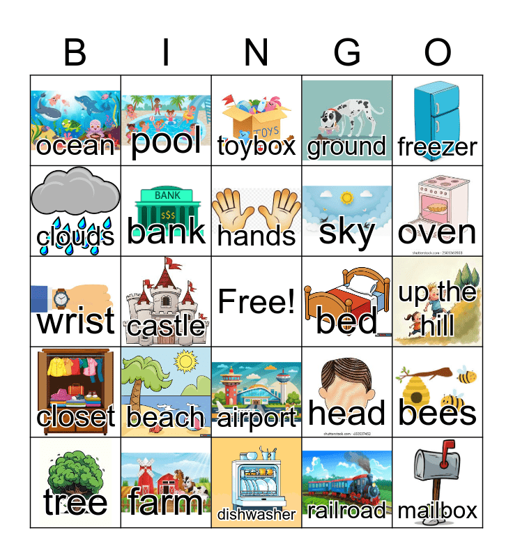 This bingo card has 24 images, a free space and 24 words: beach, farm, hands, tree, freezer, ocean, clouds, pool, bed, airport, sky, wrist, head, bees, bank, railroad, up the hill, toybox, oven, castle, mailbox, closet, ground and dishwasher.