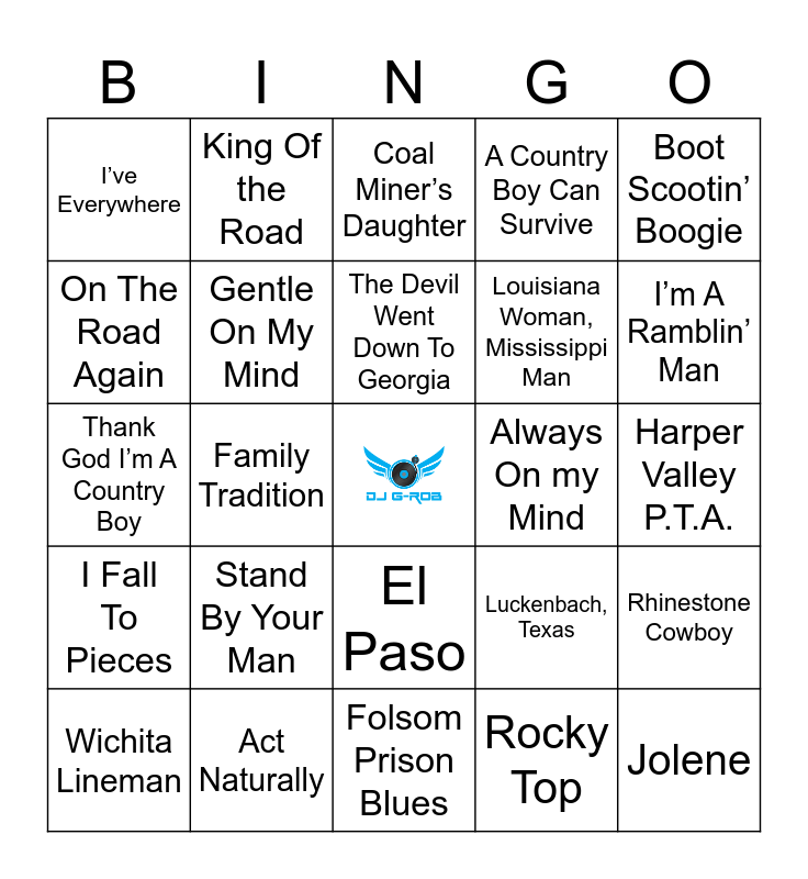 This bingo card has a free space and 46 words: He Stopped Loving Her Today, Jolene, Take Me Home, Country Roads, Folsom Prison Blues, Stand By Your Man, Ring Of Fire, King Of the Road, I Walk The Line, On The Road Again, Blue Eyes Crying In The Rain, Gentle On My Mind, A Country Boy Can Survive, Rhinestone Cowboy, Luckenbach, Texas, Kiss An Angel Good Mornin’, Take This Job And Shove It, The Devil Went Down To Georgia, Always On my Mind, Good Hearted Woman, Boot Scootin’ Boogie, Family Tradition, Rocky Top, I’ve Everywhere, Louisiana Woman, Mississippi Man, Delta Dawn, I’m A Ramblin’ Man, Wichita Lineman, Behind Closed Doors, El Paso, I Fall To Pieces, Crazy, Yesterday When I Was Young, Thank God And Greyhound, I’ve Got A Tiger By The Tail, Together Again, Act Naturally, Harper Valley P.T.A., Your Cheatin’ Heart, Hello Darlin’, D-I-V-O-R-C-E, Okie From Muskogee, Coal Miner’s Daughter, Thank God I’m A Country Boy, Dumb Blonde, Elvira and Mountain Music.