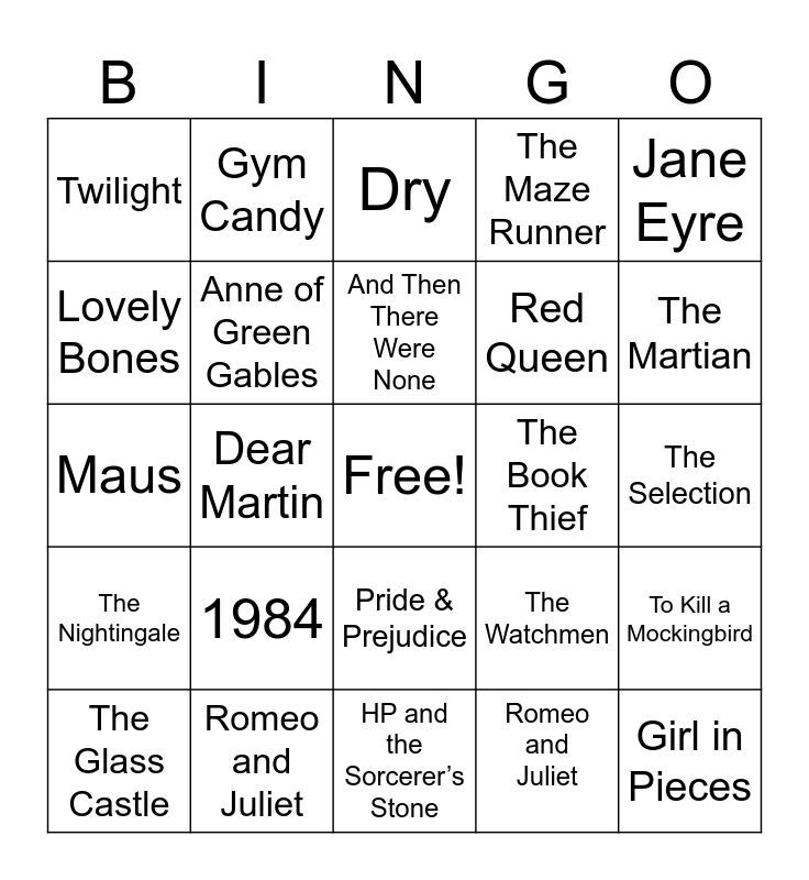 This bingo card has a free space and 25 words: 1984, HP and the Sorcerer’s Stone, And Then There Were None, The Glass Castle, Jane Eyre, Twilight, Lovely Bones, Gym Candy, The Book Thief, Pride & Prejudice, Red Queen, Maus, The Watchmen, To Kill a Mockingbird, Anne of Green Gables, The Stand, The Selection, Dry, The Martian, Dear Martin, Girl in Pieces, Romeo and Juliet, The Nightingale, The Maze Runner and Romeo and Juliet.