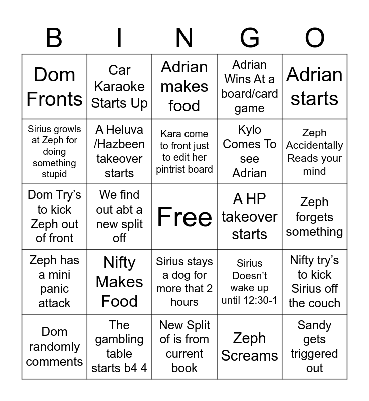 This bingo card has a free space and 24 words: Nifty Makes Food, The gambling table starts b4 4, Kara come to front just to edit her pintrist board, Dom randomly comments, Adrian starts, Dom Fronts, Sirius growls at Zeph for doing something stupid, Car Karaoke Starts Up, A HP takeover starts, Sirius stays a dog for more that 2 hours, Kylo Comes To see Adrian, Dom Try’s to kick Zeph out of front, Sirius Doesn’t wake up until 12:30-1, Nifty try’s to kick Sirius off the couch, A Heluva /Hazbeen takeover starts, Zeph Screams, Zeph forgets something, Adrian makes food, Zeph Accidentally Reads your mind, We find out abt a new split off, Sandy gets triggered out, Zeph has a mini panic attack, Adrian Wins At a board/card game and New Split of is from current book.