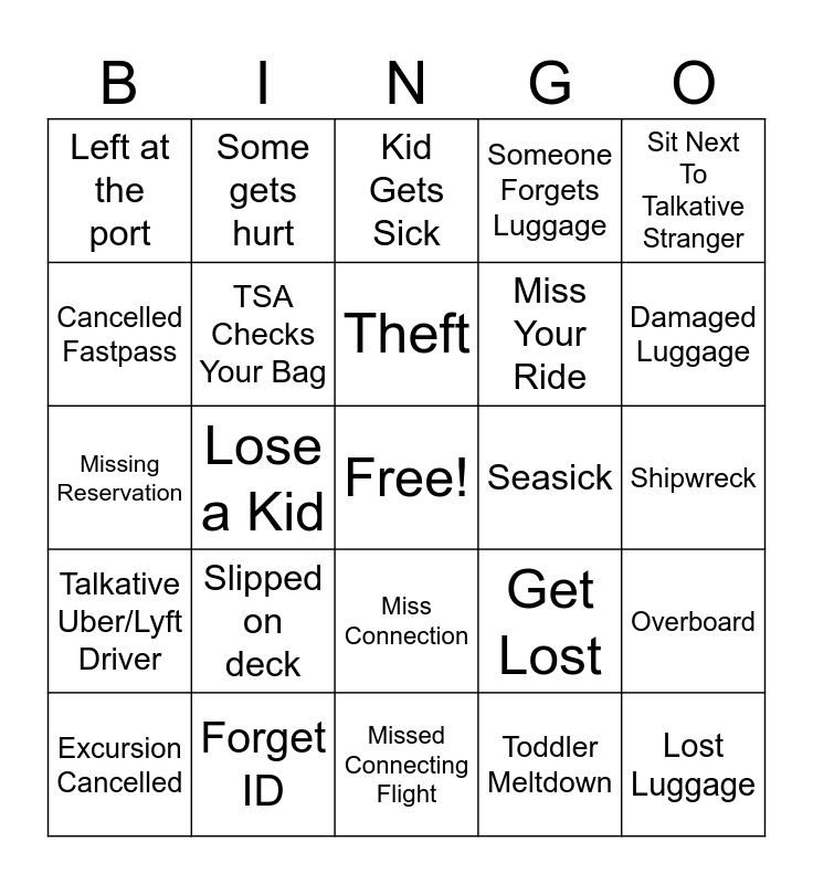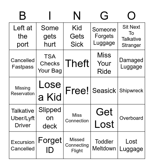 This bingo card has a free space and 29 words: Missed Flight, Forget ID, Kid Gets Sick, Forget Important Document, Sit Next To Talkative Stranger, Left at the port, TSA Checks Your Bag, Theft, Seasick, Overboard, Excursion Cancelled, Lose a Kid, Toddler Meltdown, Lost Luggage, Missing Reservation, Forget Piece of Clothing, Missed Connecting Flight, Get Lost, Damaged Luggage, Talkative Uber/Lyft Driver, Slipped on deck, Flight gets Cancelled, Miss Your Ride, Shipwreck, Cancelled Fastpass, Some gets hurt, Miss Connection, Someone Forgets Luggage and No Magical Express Tags.