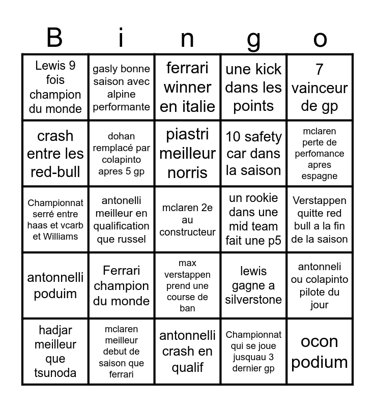 This bingo card has 25 words: Ferrari champion du monde, antonnelli crash en qualif, piastri meilleur norris, hadjar meilleur que tsunoda, 7 vainceur de gp, Lewis 9 fois champion du monde, crash entre les red-bull, gasly bonne saison avec alpine performante, un rookie dans une mid team fait une p5, max verstappen prend une course de ban, 10 safety car dans la saison, Championnat serré entre haas et vcarb et Williams, lewis gagne a silverstone, antonneli ou colapinto pilote du jour, dohan remplacé par colapinto apres 5 gp, ocon podium, Verstappen quitte red bull a la fin de la saison, ferrari winner en italie, mclaren perte de perfomance apres espagne, antonelli meilleur en qualification que russel, mclaren 2e au constructeur, mclaren meilleur debut de saison que ferrari, antonnelli poduim, une kick dans les points and Championnat qui se joue jusquau 3 dernier gp.