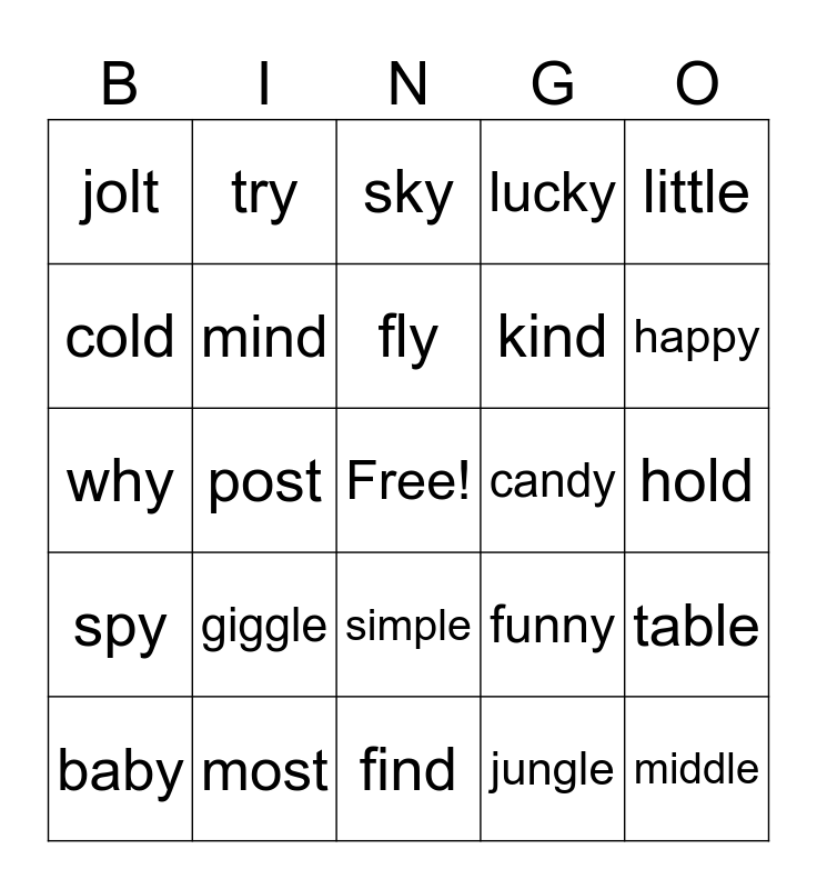 This bingo card has a free space and 24 words: giggle, most, fly, baby, little, jolt, cold, try, candy, simple, kind, why, funny, table, mind, jungle, hold, sky, happy, post, middle, spy, lucky and find.