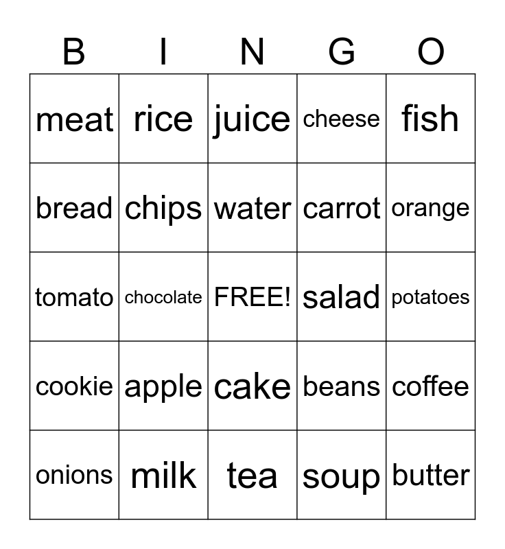 This bingo card has a free space and 24 words: apple, milk, water, onions, fish, meat, bread, rice, salad, cake, carrot, tomato, beans, coffee, chips, soup, potatoes, juice, orange, chocolate, butter, cookie, cheese and tea.
